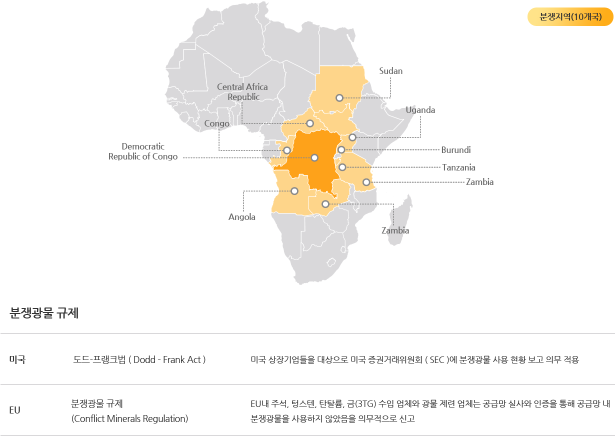 - 분쟁광물은 아프리카의 분쟁지역 (콩고 민주 공화국, 수단, 잠비아, 우간다 등 10개국)에서 채굴되는 주석, 텅스텐, 탄탈륨, 금(3TG)을 말합니다. 이들 지역에서는 무장세력들이 광물의 채굴과 유통을 장악하여, 채굴 과정에서 인권침해를 초래하고 채굴된 광물을 유통하여 자금 확보의 수단으로 사용하고 있기에 미국과 EU를 포함한 국제사회는 분쟁광물의 유통을 규제하고 있습니다.